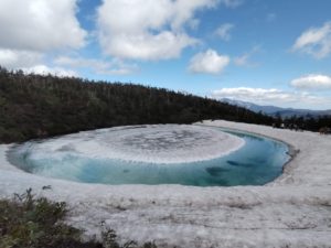 東北地方の有名な山岳観光地である八幡平の頂上近くに,噴火口に水が溜まってできた鏡沼という円形の沼があります.冬の間雪に閉ざされているのですが,雪解けとともに周囲の水が沼に流れ込んで,中央部分の雪が浮き上がって,目のように見えるので,ドラゴンアイと呼ばれます.