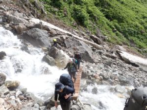 雪溪が残る登山道を登っていきます。暑い日だったので自然のクーラーは本当に気持ち良かった!