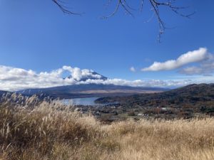 翌日は,次第に天気が回復.山中湖を望める頃には青空が見え,富士山と紅葉の進む山中湖畔の雄大な景色を楽しみました.