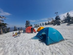 初日のテント場. 三ツ岩岳の避難小屋が入れればと思ったのですが, 雪で埋まっていて入りにくいので, 小屋の周りでテントを張りました. この日は天気に恵まれて快適でした.