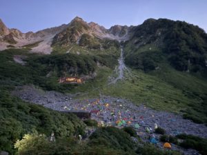 5時前, 夜明け間もなくの涸沢. 正面が北穂高岳. この時間から歩き出しました.