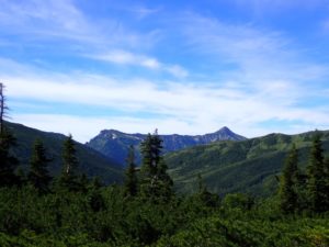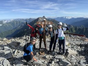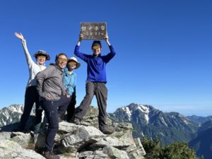 7時半, 北穂高岳山頂. 天気に恵まれました. 背後に槍ヶ岳がよく見えています.