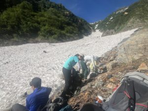 10時. 北穂高岳から奥穂高岳の間は, 険しい登山道が続きました. はるか下に, 今朝出発した涸沢ヒュッテが見えます.